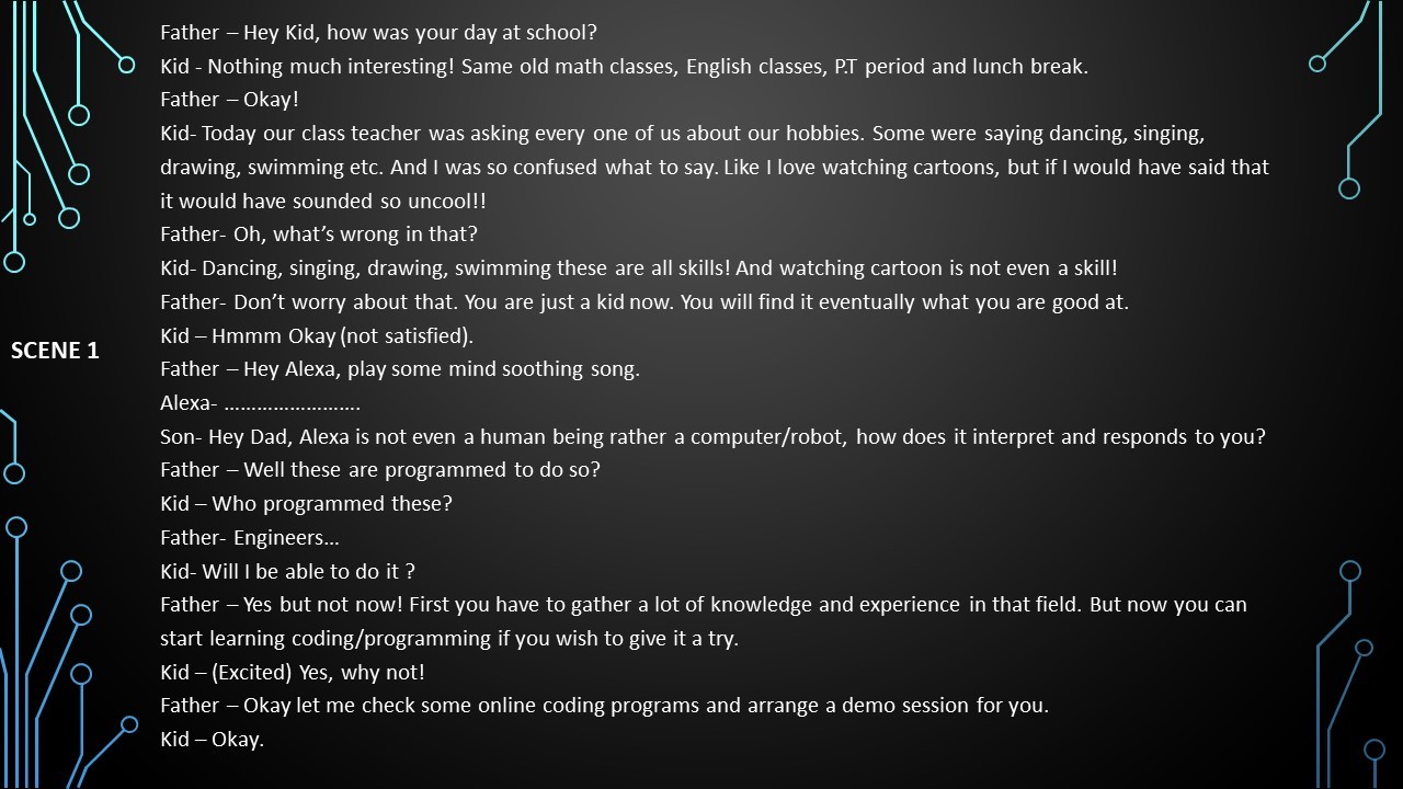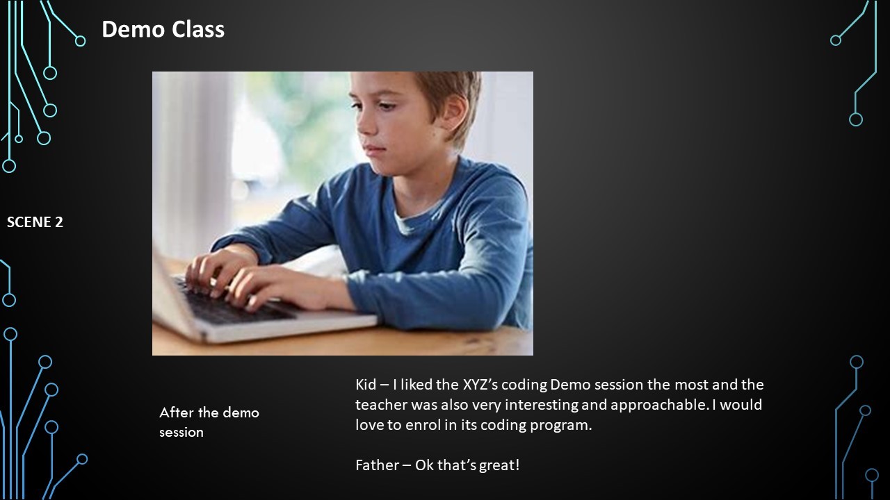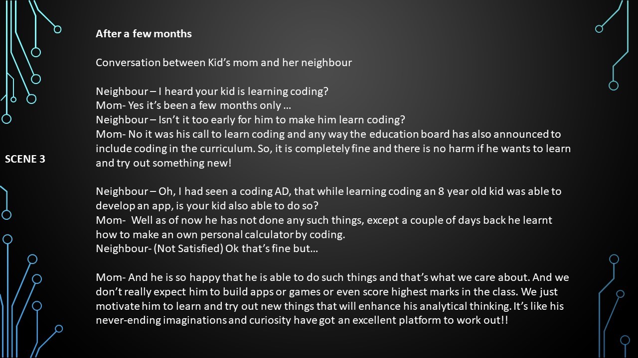I have attached a presentation giving an insight of how a promotional video can be shot to impart the true motive of coding for kids to the whole audience. I may not be that good at picturizing the whole story but maybe if more minds are put into this, it can be improvised a lot.
